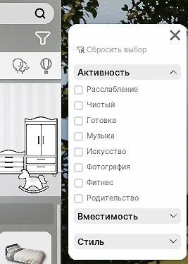Также элементы из вкладок "Строительство" и "Мебель" можно отфильтровать по стилю, а из второй вкладки — дополнительно по вместимости человек и типу активности.