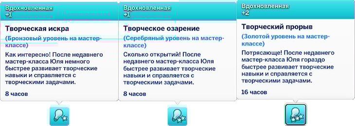 За участие в мастер-классе в качестве ученика ваш персонаж получит мудлет, который позволит ему изучать навыки быстрее! Мудлет может ускорять творческие, интеллектуальные, социальные или активные задачи в зависимости от темы посещённого мастер-класса!