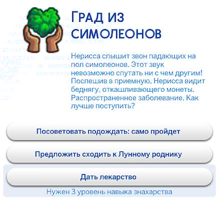 | 6 (Фитотерапевт) | Взаимодействие "Настаивать на натуральных лекарствах" |