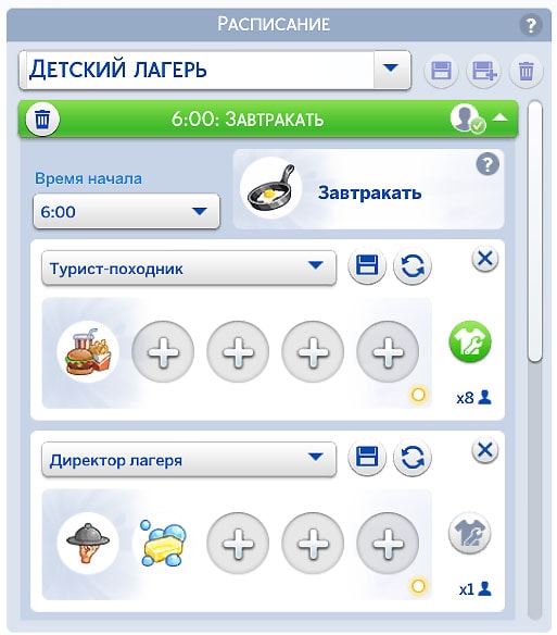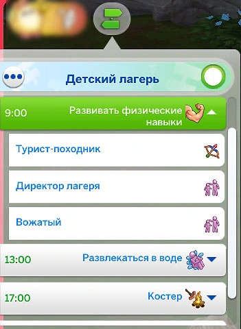 Занятия также распределяются в зависимости от роли персонажей. Например, во время завтрака в детском лагере дети будут есть, в то время как вожатые и директор лагеря — подавать еду и поддерживать чистоту!