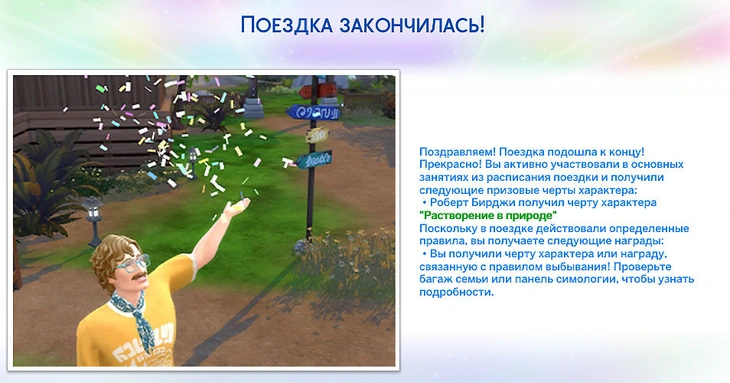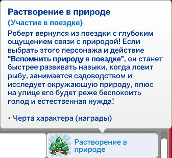 За участие в поездке персонажи могут получить черту характера «Растворение в природе», которая добавит персонажу действие "Вспомнить природу в поездке". После этого появится возбуждённый (+1) мудлет, который поможет быстрее развивать навыки рыбной ловли, садоводства и другие, что связаны с природой. На улице персонажа будут реже беспокоить голод и естественная нужда.