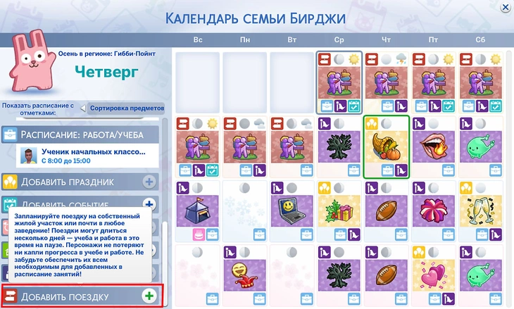 При планировании поездки через телефон или компьютер ваш персонаж немедленно отправится в путь. Чтобы запланировать будущую поездку, необходимо воспользоваться календарём. Для этого нажмите на удобный день и выберите действие "Добавить поездку".