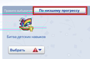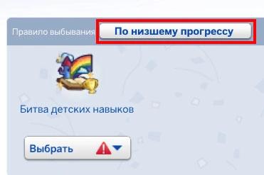 Для каждого правила выбывания можно задать условие выбывания: по низшему прогрессу или по низшему показателю. В первом случае персонажа будут судить за прогресс развития навыка или уровня отношений, во втором — сравнивать уровень навыка или отношений между участниками соревнования. Для изменения условий просто нажмите на кнопку возле слова "Правила выбывания:"!