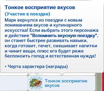 За победу в проекте персонаж может получить наградные черты характера "Обольстительный" и "Тонкое восприятие вкусов": его реже будет беспокоить голод и естественная нужда, а действие "Вспомнить вкусную поездку" даст персонажу вдохновлённый (+1) мудлет, который поможет ускоренно изучать готовку, смешивание напитков, выпечку и механику.
