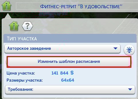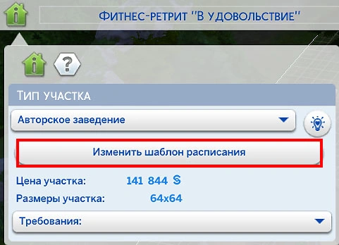 Чтобы определить, чем персонажи будут заниматься на участке, необходимо добавить туда шаблон расписания. В левой верхней части экрана нажмите на клавишу "Изменить шаблон расписания".