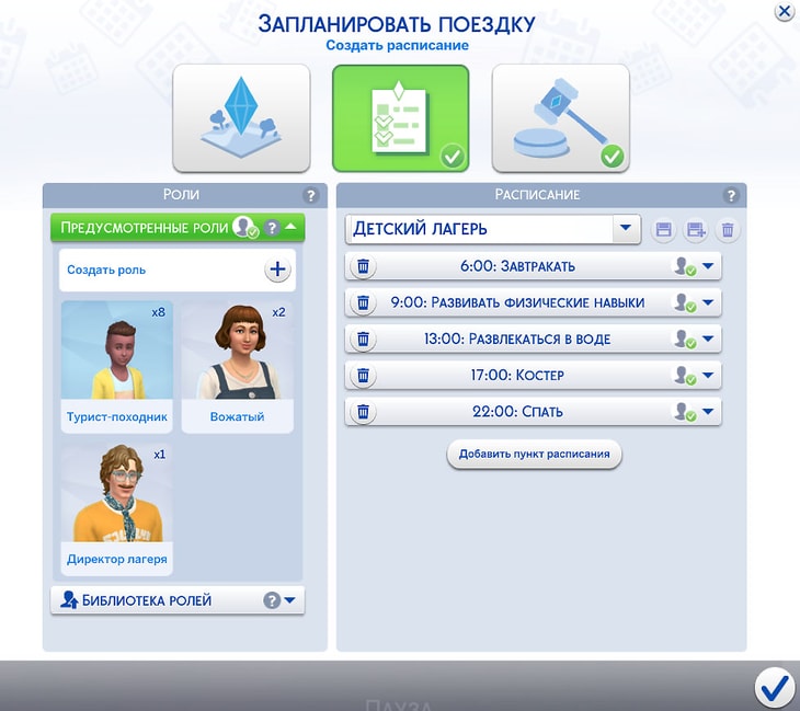 Если вы выбрали шаблон поездки, то роли и расписание будут выбраны по умолчанию с возможностью их редактирования. Вы всегда можете раскрыть знакомую поездку с другой стороны, если добавите какую-нибудь роль из библиотеки!