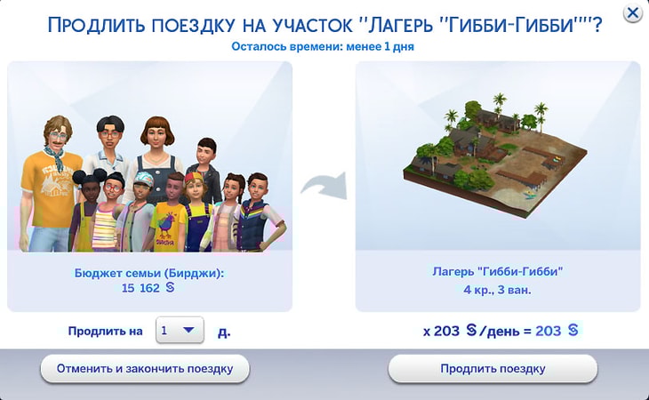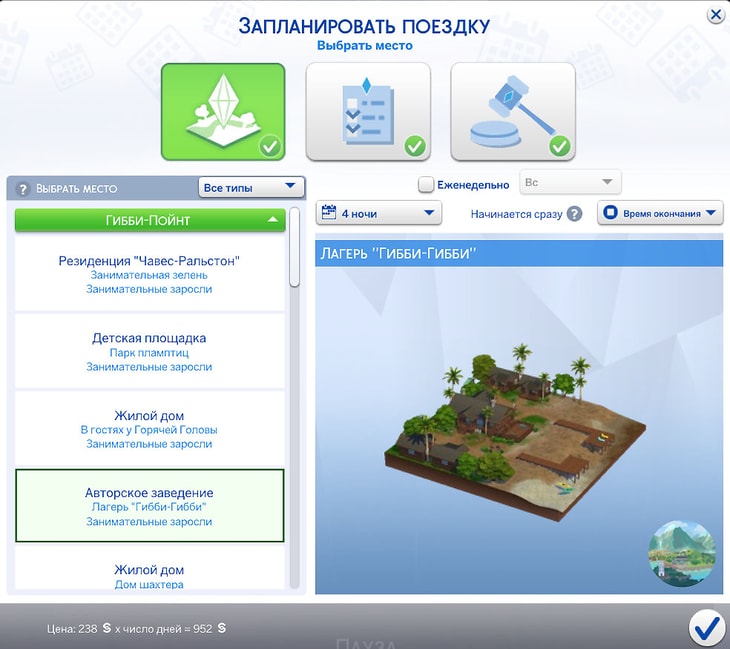 На первой вкладке вы можете выбрать место проведения поездки. При проведении поездки вне домашнего участка будет взиматься ежедневная плата, которая рассчитывается на основе стоимости участка и общего числа посетителей. Внизу экрана вы сможете увидеть ориентировочную стоимость поездки. Чем дороже стоит участок и чем меньше участников поездки, тем дороже она обходится.