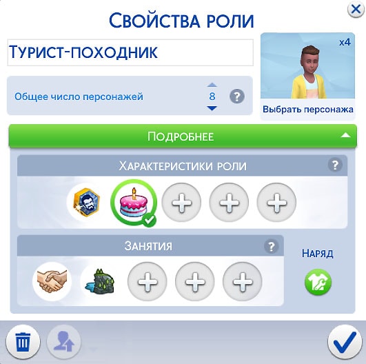 Если ни одна из созданных в игре ролей вам не подходит, вы всегда можете изменить существующую или создать свою собственную! Чтобы роли назначались подходящим персонажам, необходимо указать характеристики, по которым они будут отбираться. В качестве характеристики могут выступать: возраст, наличие навыка не ниже уровня 2, пол, романтическая ориентация, регион, черта характера, оккультизм, карьера, статус отношений, уровень знаменитости. Во избежание неуместных случаев характеристику можно сделать обязательной. Каждую роль можно переименовать, удалить или сохранить в библиотеке.
