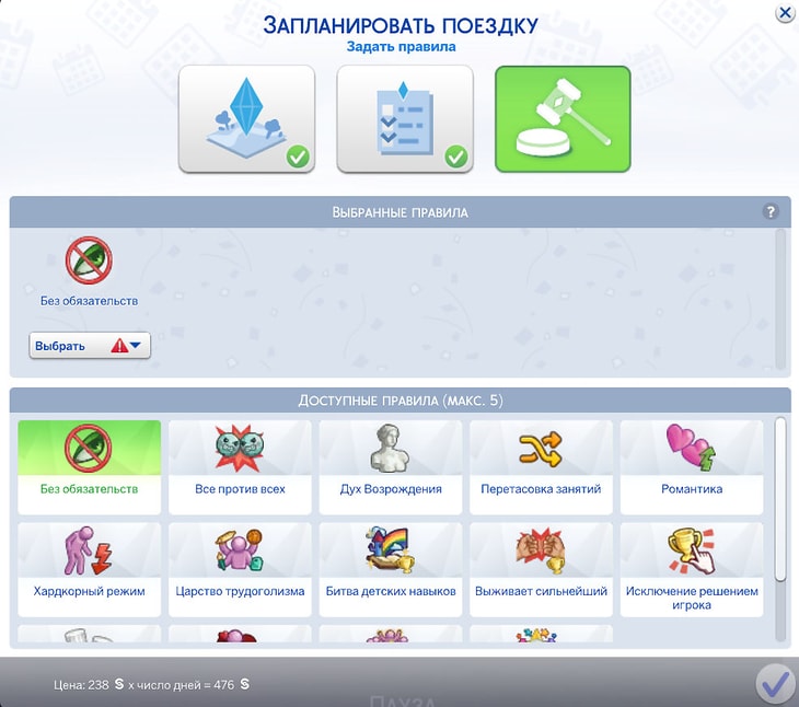 Последним этапом планирования является установление правил поездки, которых может быть до пяти. Они нужны для того, чтобы больше подстроить поездку под ваши желания, а также для усложнения пребывания персонажа. При выборе каждого правила необходимо указать роли, которых оно касается. Имейте в виду, что в зависимости от характеристик ролей не все правила подходят для некоторых персонажей: например, дети не могут участвовать в романтических соревнования из-за своего возраста.