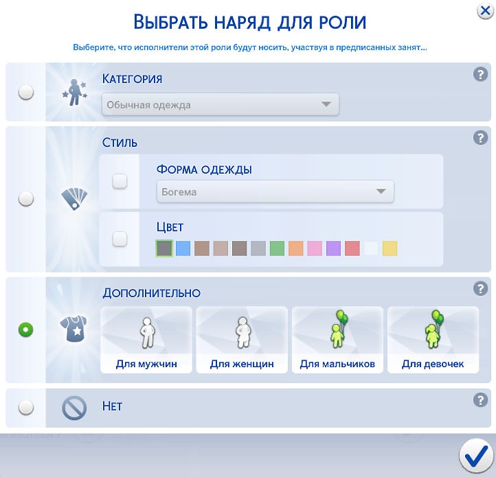 Каждая роль может иметь свой наряд, который можно настроить. Для этого необходимо нажать на круглую кнопку в виде футболки с гаечный ключом. После этого вам будет предложены варианты настройки одежды: по категории, по стилю и цветовой гамме, индивидуальную настройку согласно полу и возрасту или отсутствие отдельного наряда.