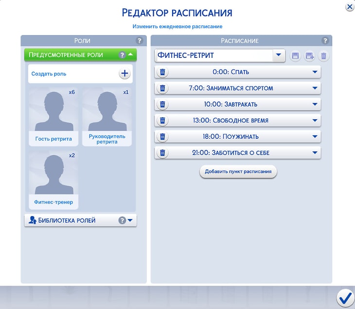 По умолчанию доступно 8 шаблонов расписания: детский лагерь, романтический проект, фитнес-ретрит, арт-ретрит, дом престарелых, конкурс популярности, кулинарный конкурс, уютный отель. Основными поездками по умолчанию являются первые три.