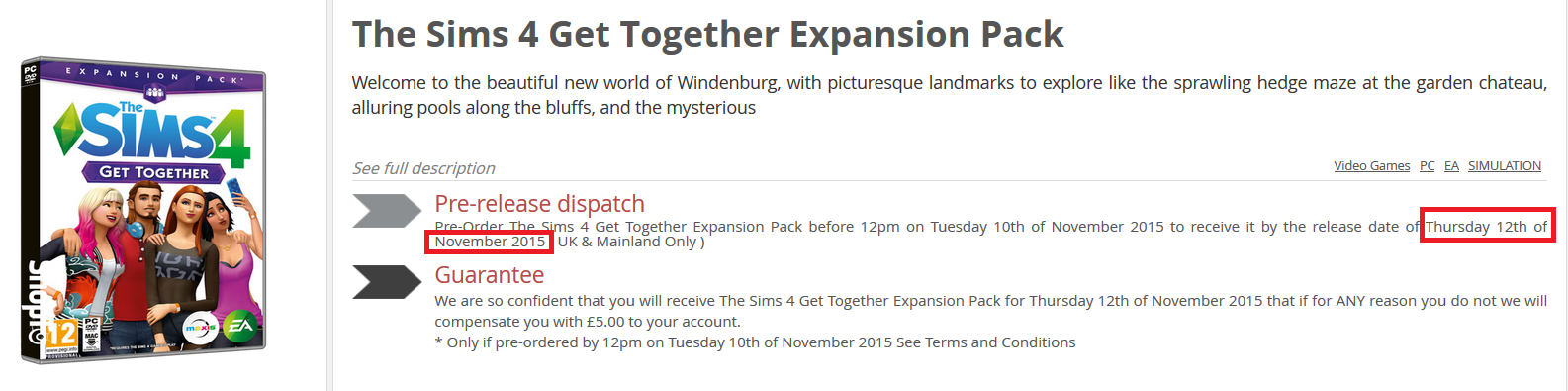 Согласно двум британским интернет-магазинам, Amazon UK и ShopTo, дата релиза The Sims 4 «Веселимся вместе» в Великобритании назначена на 12 ноября. Это совпадает с последними заявлениями от ЕА, согласно которым их игры в Великобритании будут теперь выходить по четвергам вместо пятниц, чтобы быть ближе к европейским релизам.