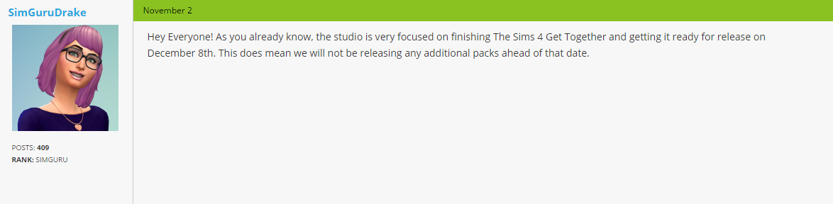 Привет всем! Как вы знаете, студия сосредоточена на завершении работ по The Sims 4 «Веселимся вместе!» и готовит дополнение к выпуску 8 декабря. Это означает, что до этого времени никаких DLC не будет.
