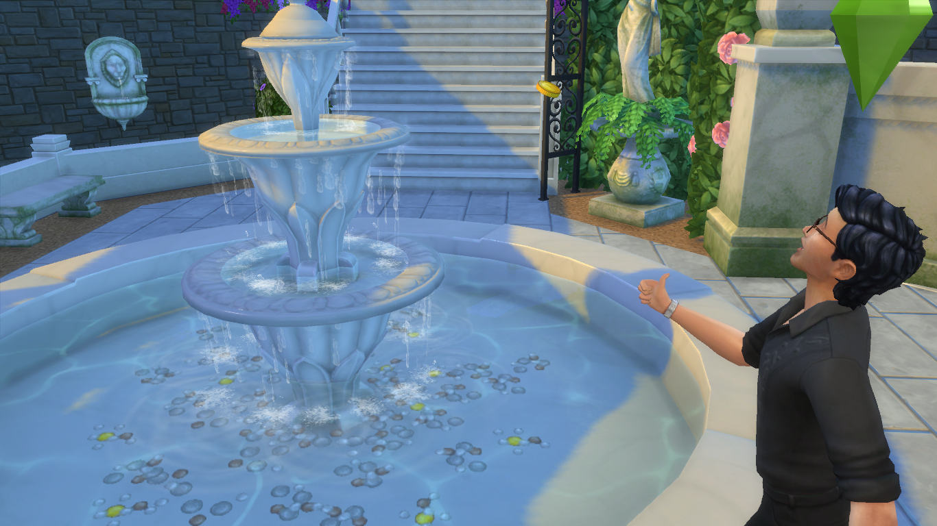 Также во время того, как ваши симы сидят на краю фонтана, доступно новое романтическое взаимодействие «Брызгаться водой из фонтана».