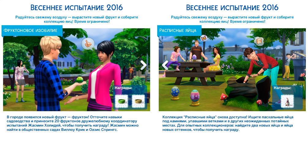 На сей раз в центре внимания весенние испытания, которые состоят из уже знакомого нам испытания с пасхальными яйцами и новым испытанием «Фруктоновое изобилие». Собственно после обновления вы увидите такое вот окошко, в котором рассказывают их суть.