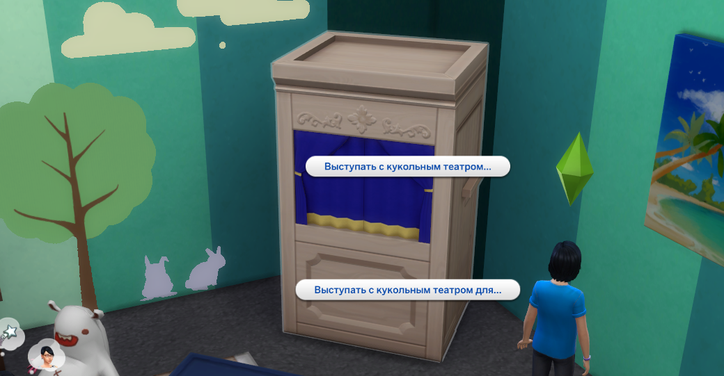 Благодаря кукольному театру маленькие симы могут порадовать других симов (к примеру своих родителей), показав им представление. С этим предметом доступно два действия "Выступать с кукольным театром..." и "Выступать с кукольным театром для..." данные действия доступны только детям, взрослые могут быть только зрителями.